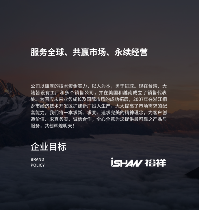 公司以雄厚的技術資金實力,以人為本,勇于進取。現在臺灣、大陸皆設有工廠和多個銷售公司,并在美國和越南成立了銷售代表處。為因應未來業(yè)務成長及國際市場的成功拓展,2007年在浙江桐鄉市經濟技術開發(fā)區擴建新廠投入生產,大大提高了市場需求的配套能力。我們將一本求新、求變、追求完美的精神理念,為客戶創(chuàng)造價值、求真務實、誠信合作,全心全意為您提供最可靠之產品與服務,共創(chuàng)輝煌明天!